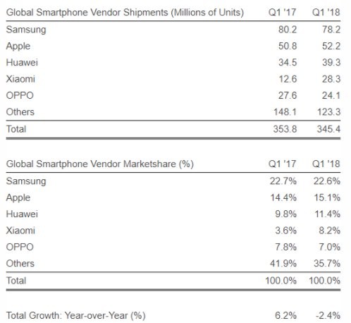 A Apple se manteve em seu segundo lugar, com 52,2 milhões de unidades, contra os 50,8 registrados anteriormente. Já a Huawei cresceu de 34,5 para 39,5 milhões. Chega então o quarto lugar, agora da Xiaomi, que vendeu o dobro do que o mesmo período no ano passado, saltando de 12,6 para 28,3 milhões de smartphones vendidos. Enquanto isso, a Oppo caiu de 27,6 para 24,1 milhões de aparelhos.